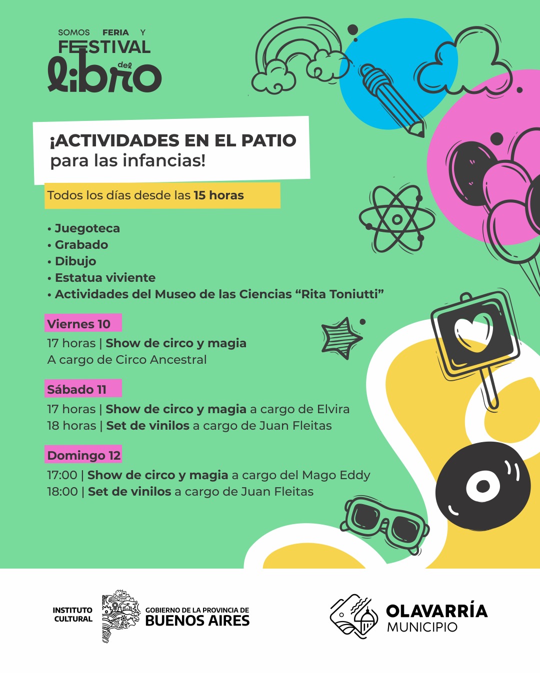 Asimismo en el patio, todos los días, desde las 15:00 horas habrá diferentes propuestas para las infancias, que comprenden juegos, dibujo, shows de circo y magia, entre otras opciones destinadas para las infancias.