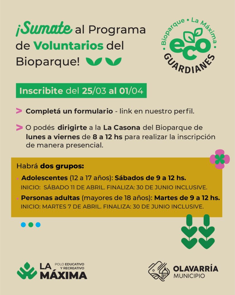 El Municipio de Olavarría informa que desde este miércoles 25 y hasta el lunes 30 de marzo inclusive se abre la convocatoria para ser parte del Programa de Voluntarios del Bioparque “Ecoguardianes”.