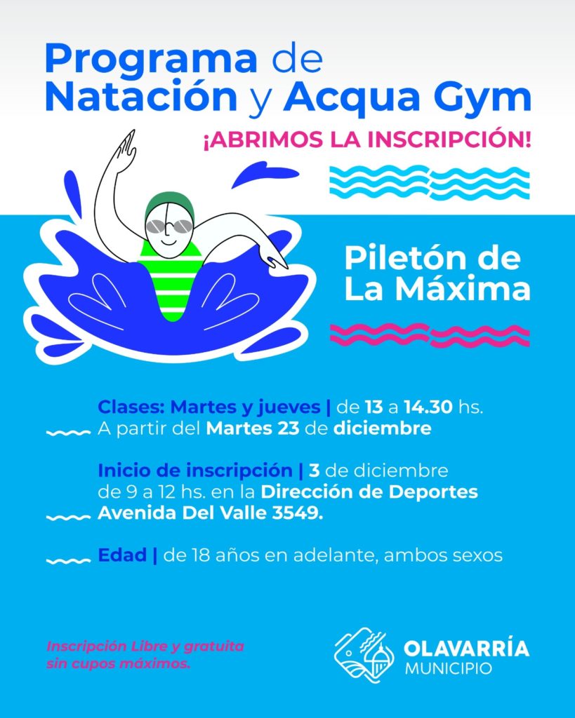 El Municipio de Olavarría informa que este miércoles 3 de diciembre abrirá la inscripción para una nueva temporada del Programa de Natación y Acua Gym para personas mayores de 18 años, una propuesta que es brindada de manera libre y gratuita desde la Subsecretaría de Deportes en el Piletón del Bioparque Municipal La Máxima.