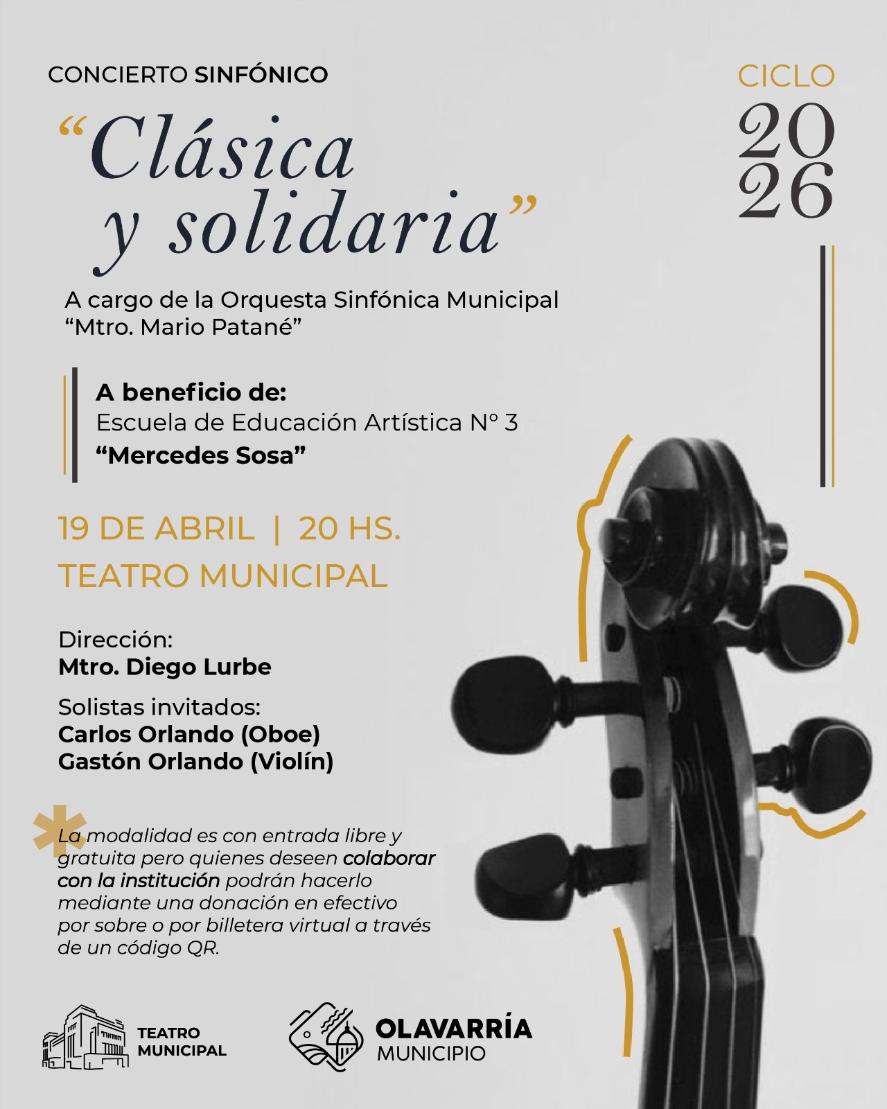 Este domingo 19 de abril, a las 20 horas, en el Teatro Municipal se llevará a cabo el primer concierto del ciclo “Clásica y Solidaria 2026” a cargo de la Orquesta Sinfónica Municipal dirigida por el mtro. Diego Lurbe, y en esta oportunidad será a beneficio de la Escuela de Educación Artística N° 3 “Mercedes Sosa”.