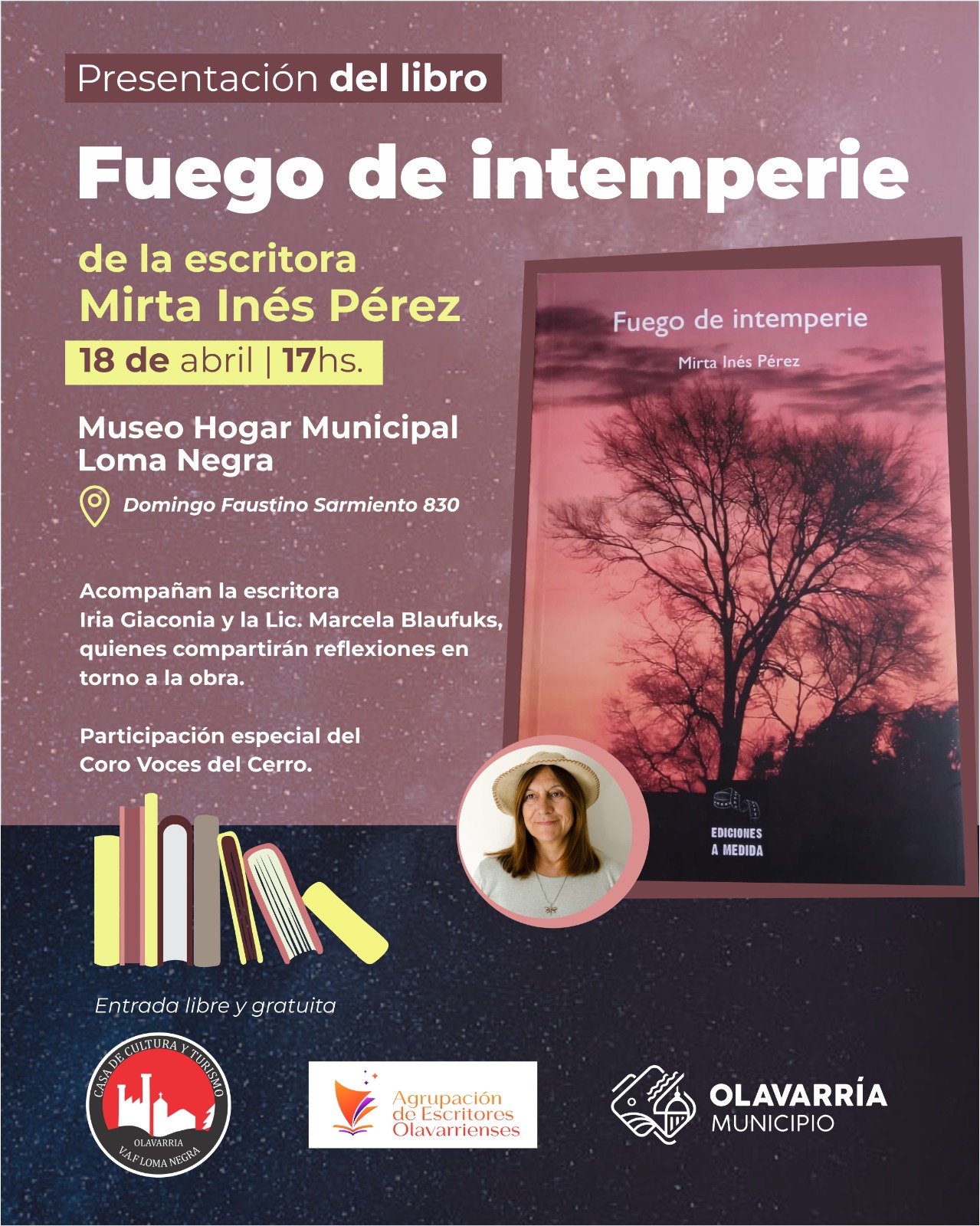 Este sábado 18 de abril, a las 17 horas, en el Museo Hogar Loma Negra, se realizará la presentación del libro “Fuego de intemperie” de la autora Mirta Inés Pérez, integrante de la Agrupación de Escritores Olavarrienses. La autora estará acompañada por la escritora Iria Giaconia y la Lic. Marcela Blaufuks, quienes compartirán reflexiones en torno a la obra.
