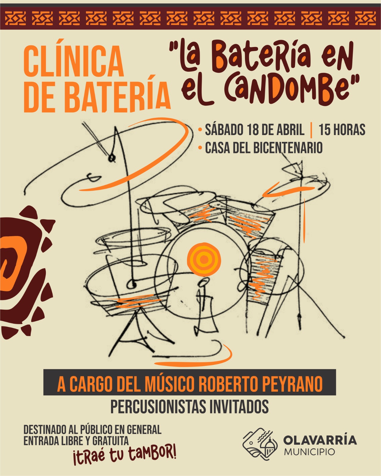 El Municipio de Olavarría invita a participar de la clínica de batería que brindará el reconocido músico local Roberto Peyrano, que se realizará este sábado 18 de abril, a las 15 horas, en la Casa del Bicentenario.