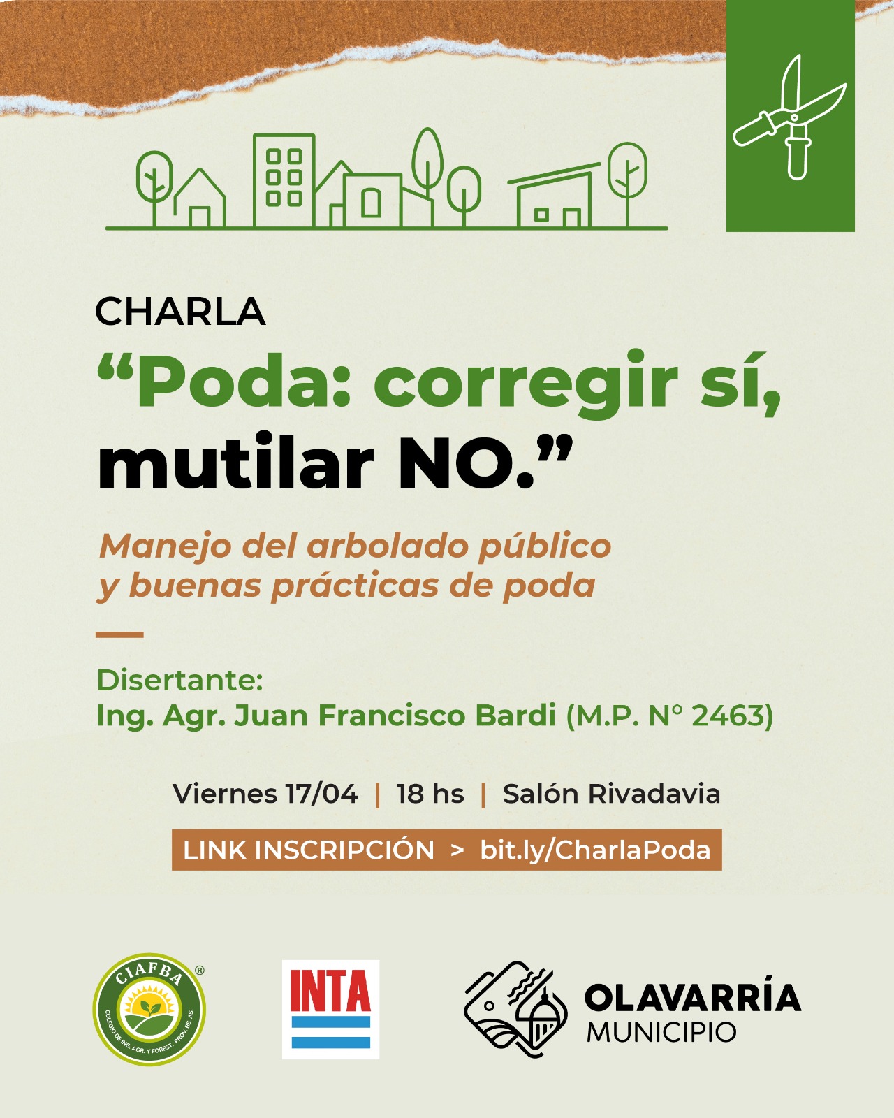 El Municipio, a través de la Dirección de Desarrollo Agropecuario, invita a participar de una charla abierta a toda la comunidad sobre manejo del arbolado público y buenas prácticas de poda.