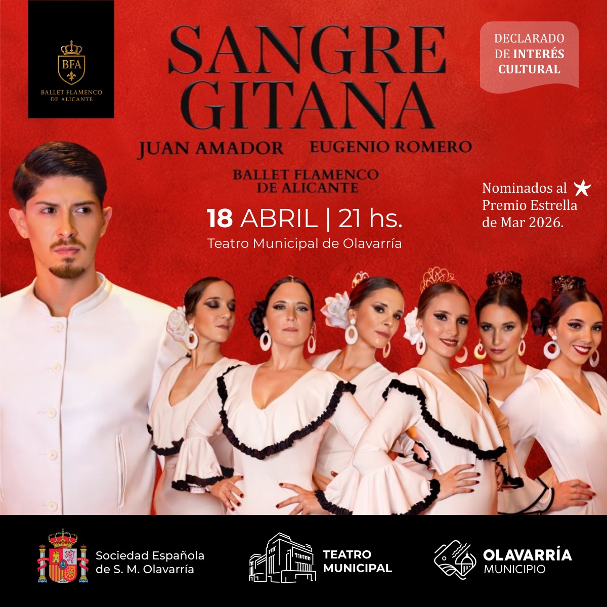 La Sociedad Española de Olavarría presenta “Sangre Gitana” que estará el próximo 18 de abril, a las 21 horas, en el Teatro Municipal. Se trata de una producción internacional del Ballet Flamenco de Alicante, compañía fundada y dirigida por el bailaor español Juan Amador.