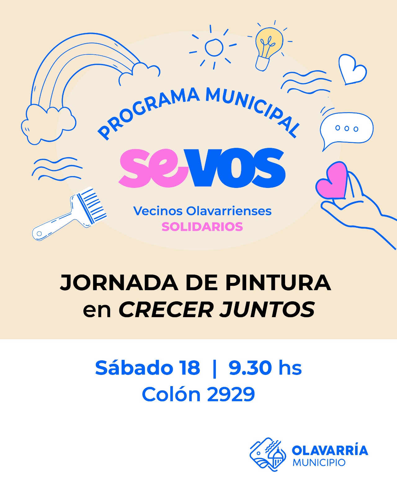 Este sábado 18 de abril en la sede de “Crecer Juntos” (Av. Colón 2929) se llevará a cabo la primera jornada del año del Programa Municipal “Se VOS” (Vecinos Olavarrienses Solidarios).