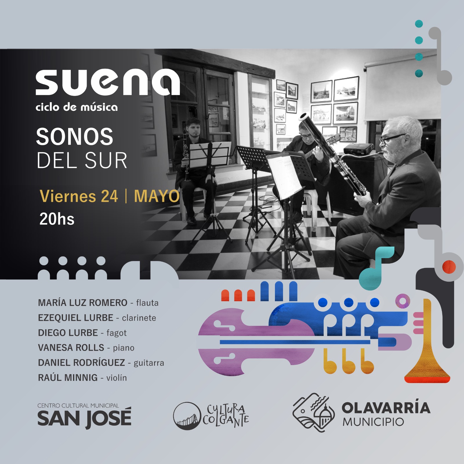 Por la noche de este viernes 24 de mayo, desde las 20 horas, en el Centro Cultural Municipal “San José” habrá música en vivo con la presentación de Sonos del Sur, en el marco de la cuarta edición del ciclo “Suena”, que es organizado en forma conjunta con la Asociación Civil “Cultura Colgante”.