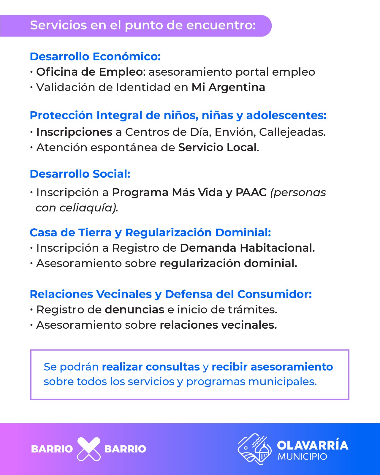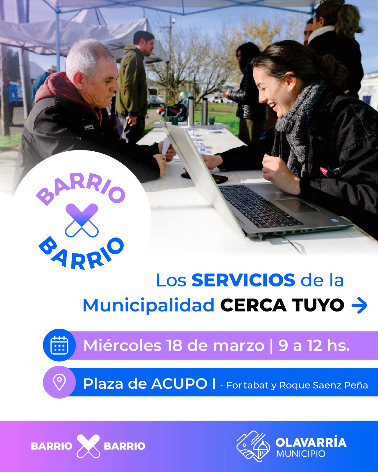El Municipio de Olavarría continua con el despliegue del Programa “Barrio por Barrio”, el dispositivo de abordaje territorial e integral que recorre cada punto del Partido, acercando a la comunidad la gestión de trámites y servicios que son llevados a cabo desde la comuna, pero también atención de consultas e información en general. Este miércoles será el turno de los barrios Provincias Argentinas y Acupo I.