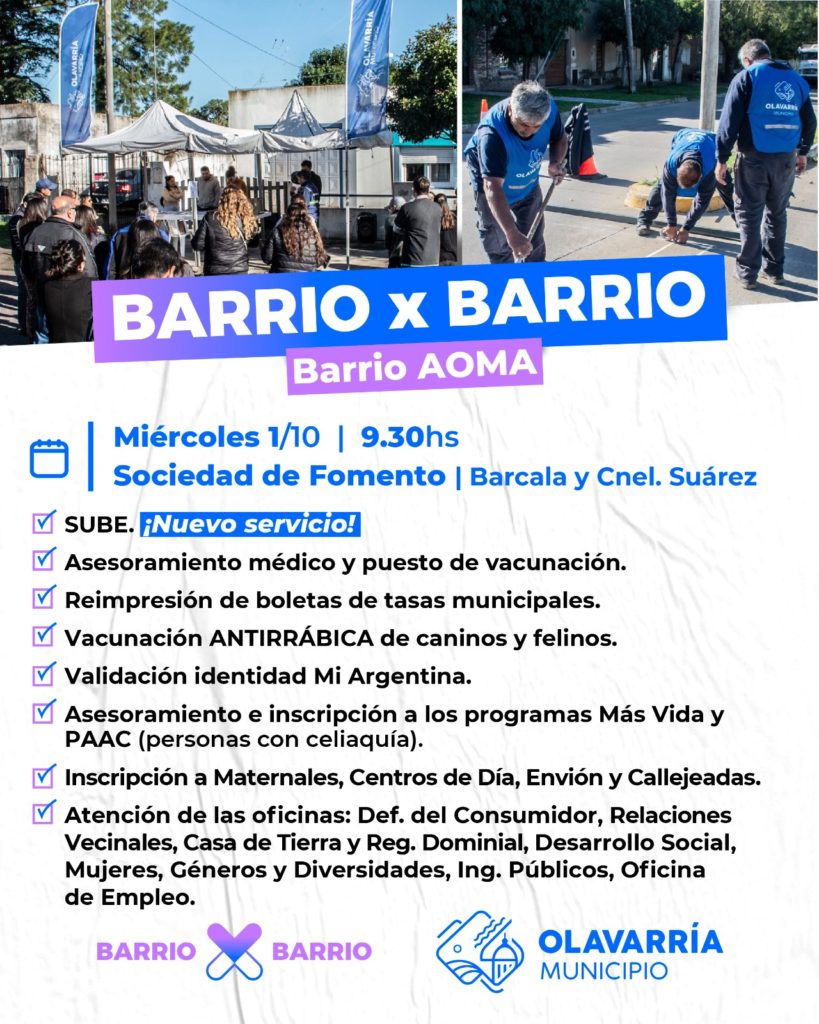 El Municipio de Olavarría recuerda que, como sucede cada miércoles, este 1 de octubre se llevará a cabo una nueva edición del Programa Municipal “Barrio por Barrio”.