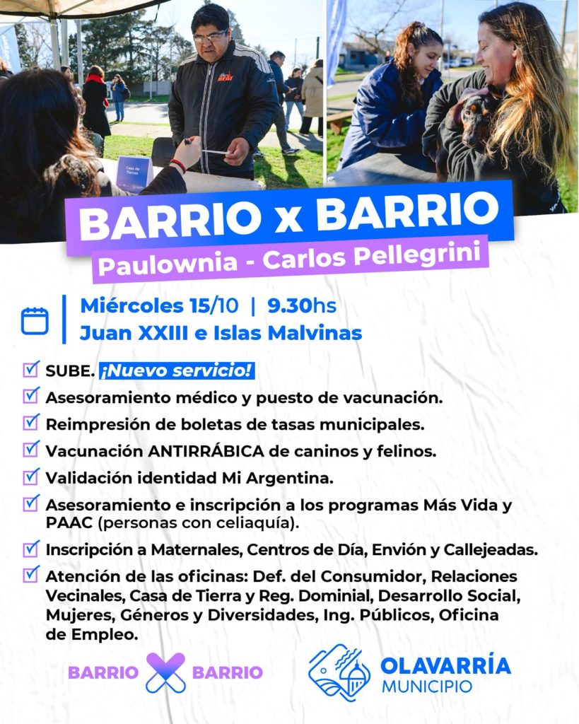El Municipio de Olavarría informa que, como sucede semana a semana los días miércoles, este 15 de octubre se llevará a cabo una nueva jornada enmarcada en el Programa Municipal “Barrio por Barrio”.