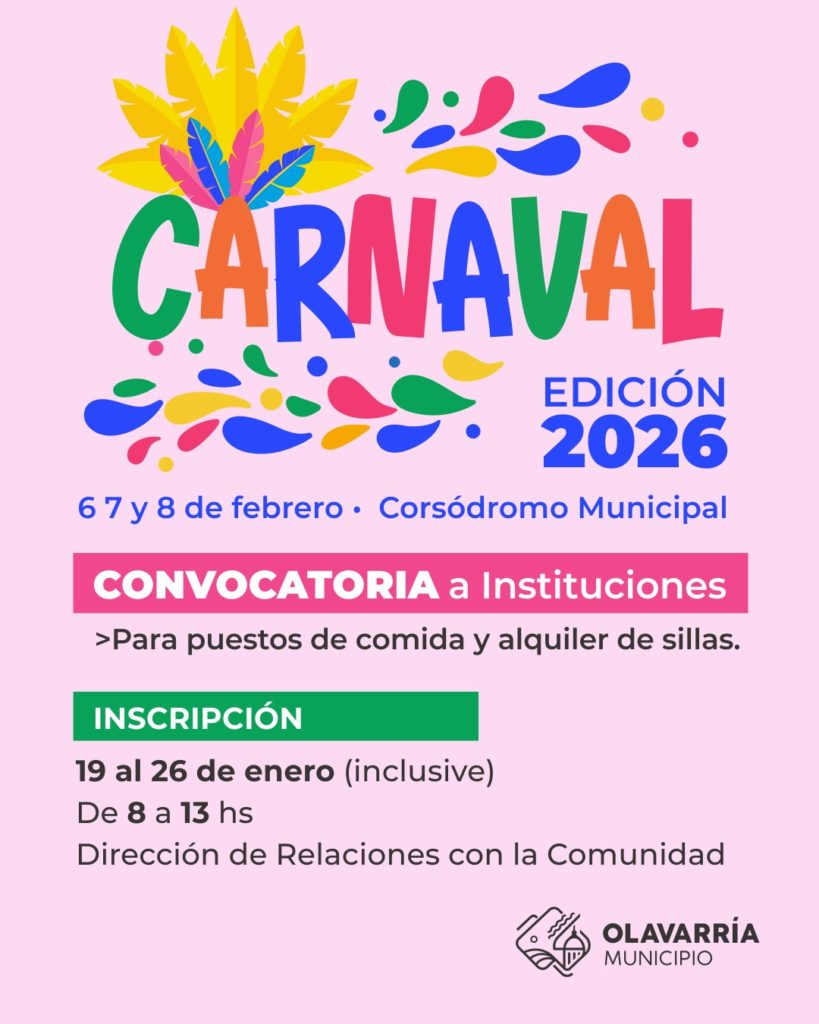 El Municipio de Olavarría recuerda que hasta el lunes 26 de enero inclusive se encuentra abierta la inscripción para instituciones interesadas en participar los Carnavales Oficiales 2026 con puestos de comida y alquiler de sillas.