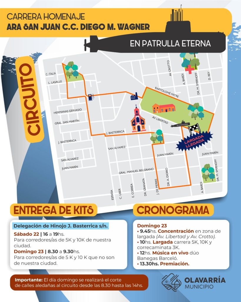 Comenzó la cuenta regresiva de cara a la carrera “Homenaje ARA San Juan – Capitán de Corbeta Diego M. Wagner”, que se concretará el próximo domingo 23 de noviembre en Hinojo. Una prueba que no sólo tendrá su lado deportivo, sino también tendrá su ribete solidario, ya que lo recaudado será donado a dos establecimientos educativos del Partido. En ese marco, se detalla cuál sera el cronograma de actividades vinculadas al evento, que se iniciarán desde el sábado y culminar en la tarde del domingo.