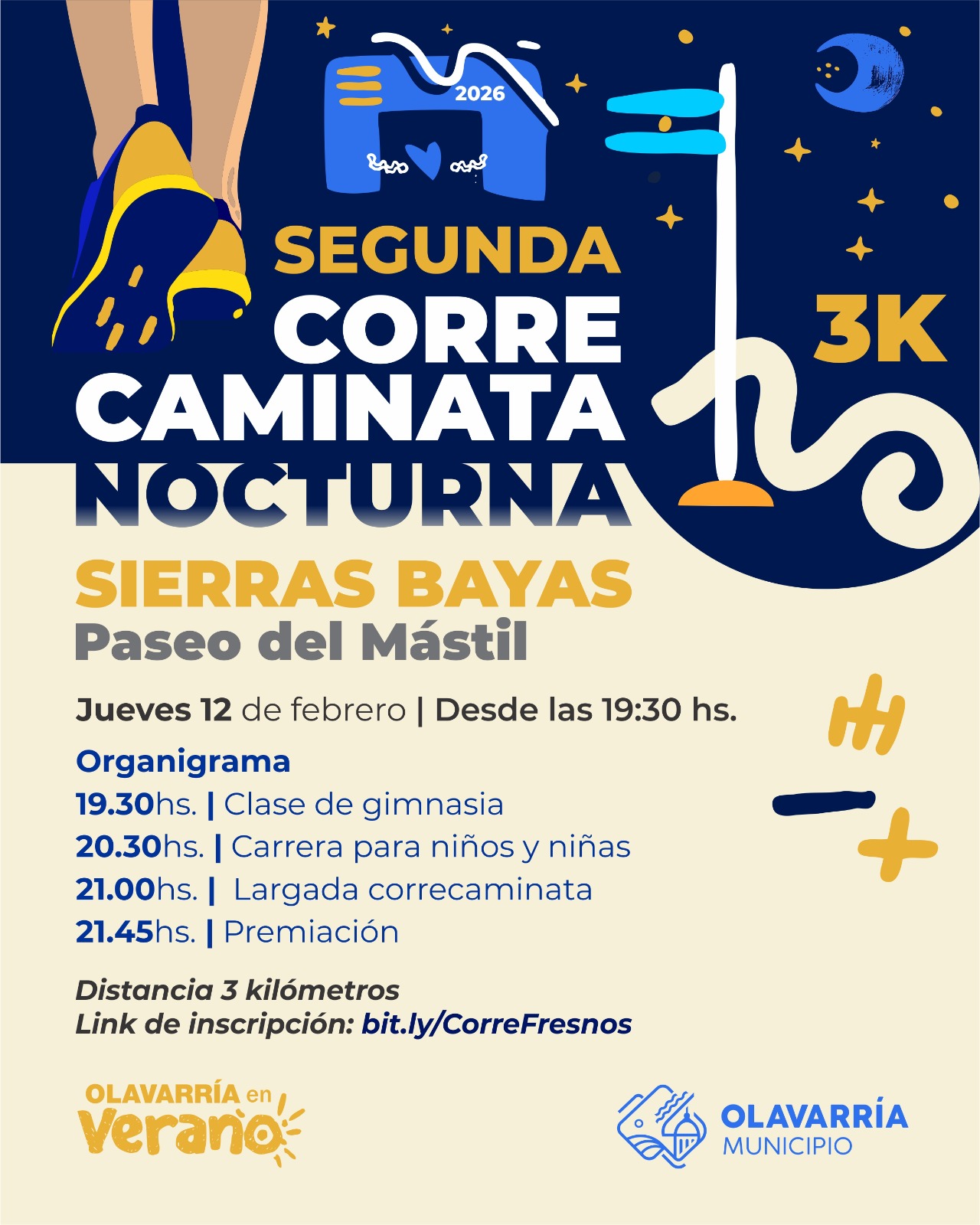 En el marco de las innumerables propuestas del Programa “Olavarría en Verano”, organizado por el Municipio de Olavarría, el próximo jueves 12 de febrero se llevará a cabo la segunda Correcaminata Nocturna 2026 en la localidad de Sierras Bayas, bajo la coordinación de la Subsecretaría de Deportes.