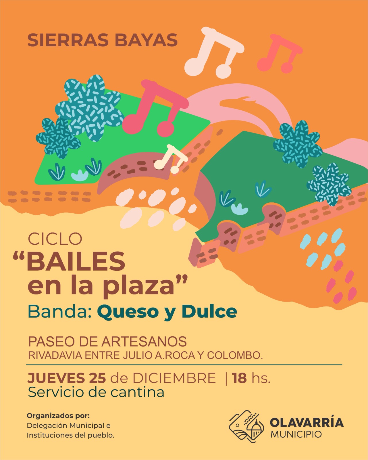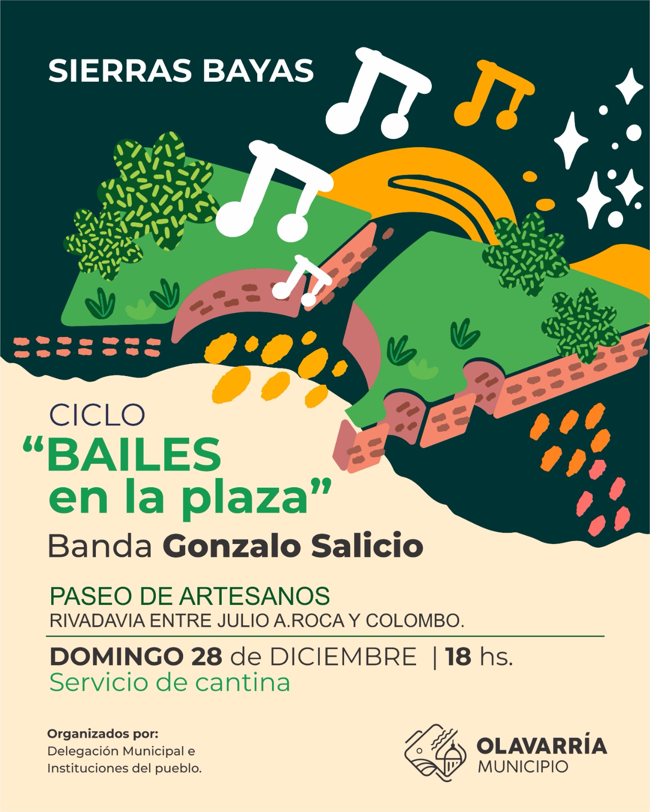 Desde la Delegación Municipal de Sierras Bayas se invita a toda la comunidad del Partido de Olavarría a participar de las próximas jornadas del ciclo “Bailes en la Plaza”, que se desarrollarán los días jueves 25 y domingo 28 de diciembre.