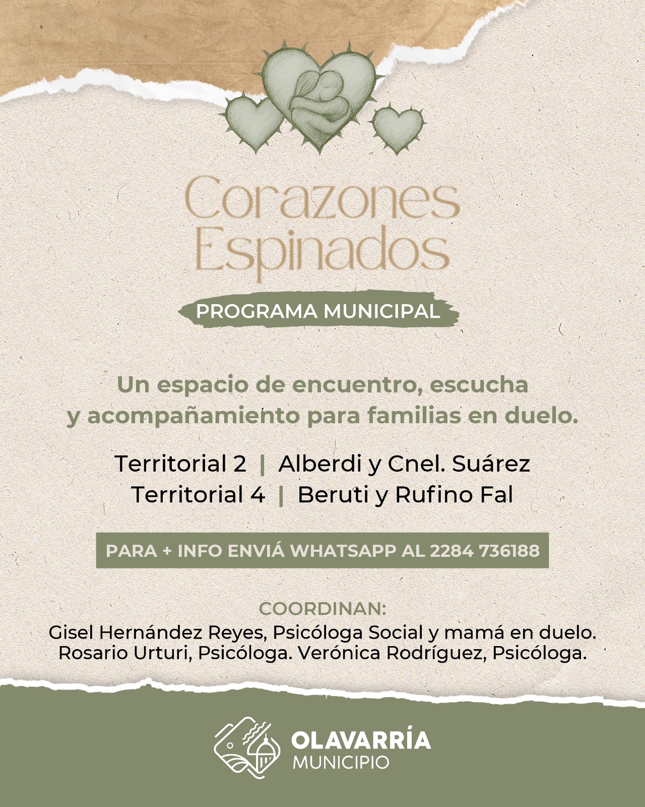 El Municipio de Olavarría brinda a la comunidad el espacio de acompañamiento “Corazón Espinado”, que está destinado a personas que han perdido un hijo/a. Se trata de encuentros abiertos que de manera regular se llevan a cabo en espacios municipales, encabezados por profesionales y con el objetivo precisamente de brindar asistencia y compañía. Vale destacar que cuenta con la supervisión del Servicio de Salud Mental.