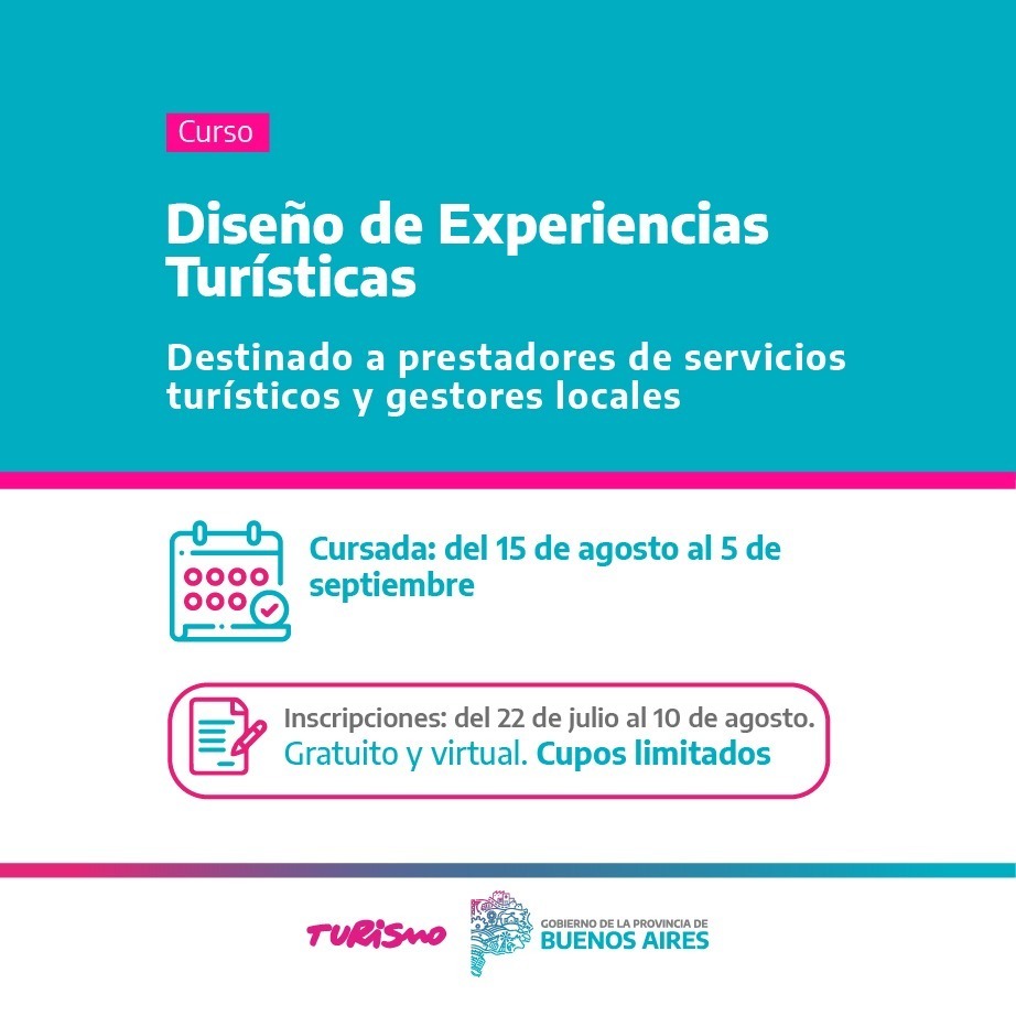 El curso, que será gratuito y de modalidad virtual, se iniciará el 15 de agosto y se extenderá hasta el 5 de septiembre, dirigido a gestores/as locales y prestadores de servicios turísticos. Las personas interesadas ya pueden anotarse, y tendrán tiempo hasta el 10 de agosto a través del formulario online al que se accede haciendo click aquí.
