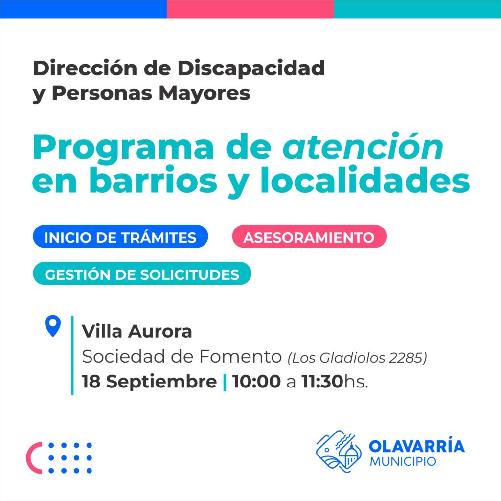 El Municipio de Olavarría recuerda que desde la Dirección de Discapacidad y Personas Mayores se está desplegando desde hace ya varias semanas un Programa de Atención Descentralizada en barrios y localidades del Partido, con el objetivo de acercar a toda la comunidad los servicios y gestiones que se brindan desde esa área.