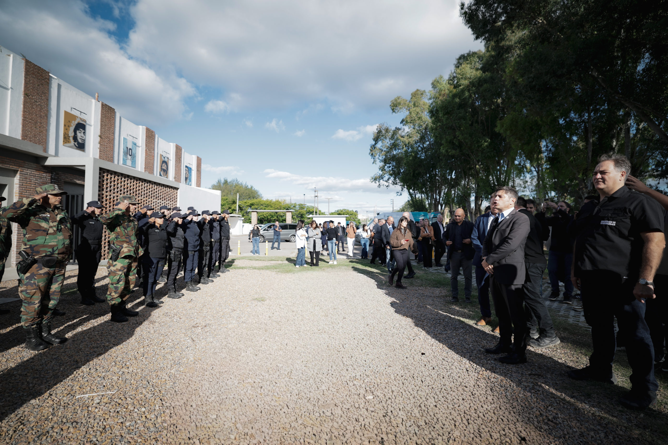 Luego todo se trasladó al acceso principal al edificio del Centro Municipal “Diego Armando Maradona”, donde se dispuso una formación policial integrada, por un lado, por los flamantes oficiales del Comando de Patrullas. Se trata de los 20 nuevos agentes que fueron incorporados a la mencionada competencia gracias a las gestiones realizadas desde el Municipio, a través de la Secretaría de Protección Ciudadana, ante el Ministerio de Seguridad. El intendente Wesner junto al gobernador Kicillof, el ministro Alonso y el secretario Quintas dieron la bienvenida formal y el saludo a cada uno de los agentes.