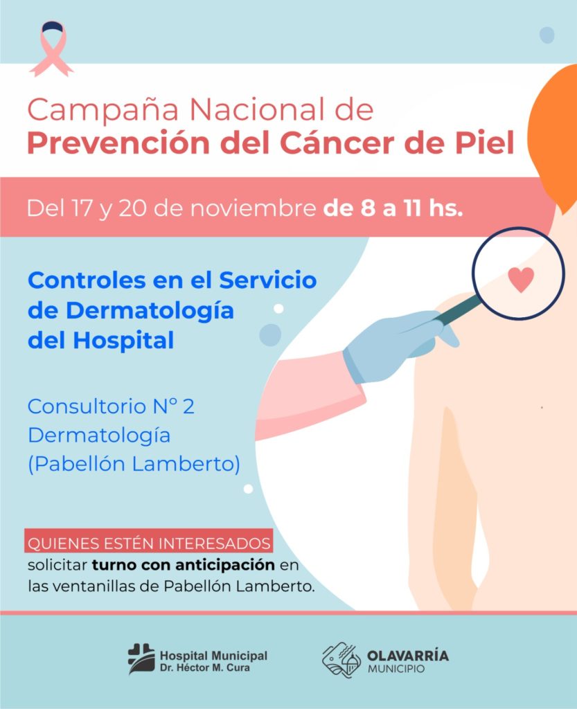 En este marco, se refuerza la atención en el Consultorio Nº 2 Dermatología (Pabellón Lamberto), desde ayer lunes 17 hasta el jueves 20 de noviembre inclusive, de 8:00 a 11:00 horas (personas interesadas en realizarse los controles, deben solicitar turnos con anticipación en las ventanillas del Pabellón Lamberto).