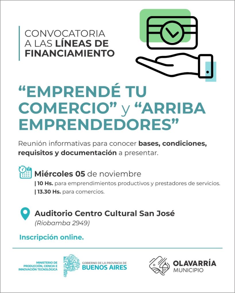 Con el objetivo de asesorar y acompañar la postulación a estas líneas, se llevarán a cabo reuniones informativas para conocer bases, condiciones, requisitos y documentación a presentar. Dichas reuniones se realizarán el día miércoles 5 a las 10:00 horas, para emprendimientos productivos y prestadores de servicios, y a las 13:30 horas para comercios. En ambos casos la sede será el Auditorio del Centro Cultural Municipal “San José” (Riobamba 2949).