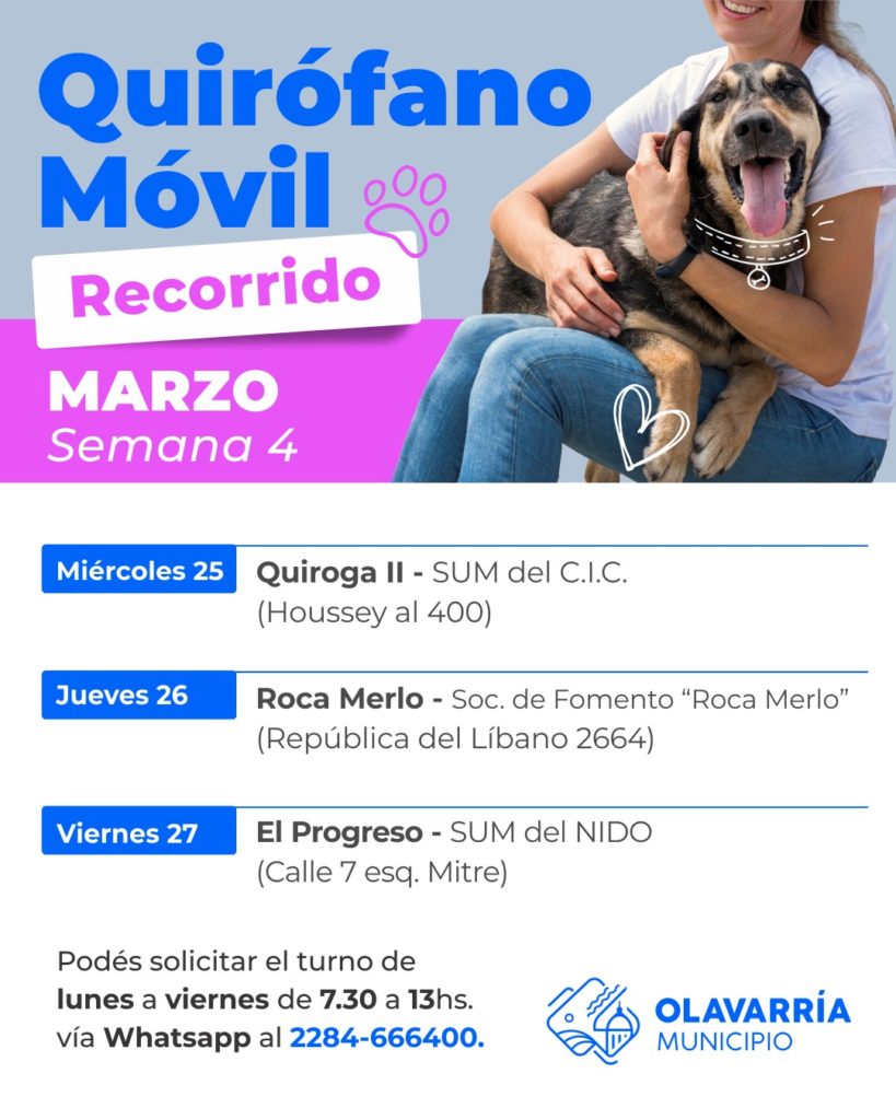El Municipio de Olavarría informa el recorrido del Quirófano Veterinario Móvil en la cuarta semana del mes de marzo.