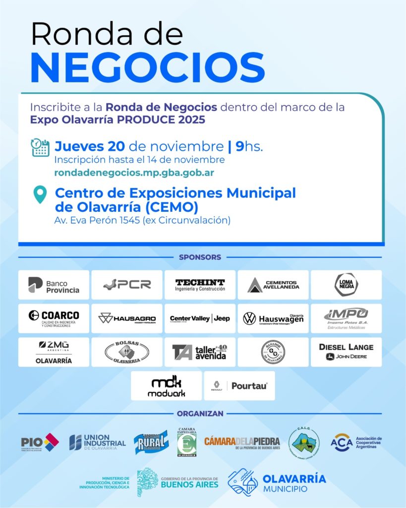 Se trata de una actividad diseñada y pensada con el objetivo de mostrar la riqueza y diversidad productiva con la que cuenta nuestro Partido, además de propiciar un espacio de intercambio y vinculación comercial. Se recuerda que aquellas firmas interesadas en participar de la ronda de negocios podrán sumarse a través del formulario online al que se accede haciendo clic aquí.  Específicamente, la ronda de negocios se llevará a cabo el 20 de noviembre, desde las 9 horas, organizada en conjunto con el Ministerio de Producción, Ciencia e Innovación de la Provincia de Buenos Aires.