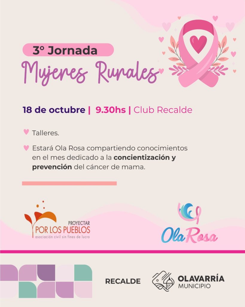 El Municipio de Olavarría invita a la comunidad a participar de la 3ª jornada de Mujeres Rurales que el próximo sábado 18 de octubre se llevará a cabo en el Club Recalde, una propuesta que surge el trabajo articulado y conjunto de diversas áreas municipales, la asociación civil Ola Rosa y la asociación civil Proyectar los Pueblos.