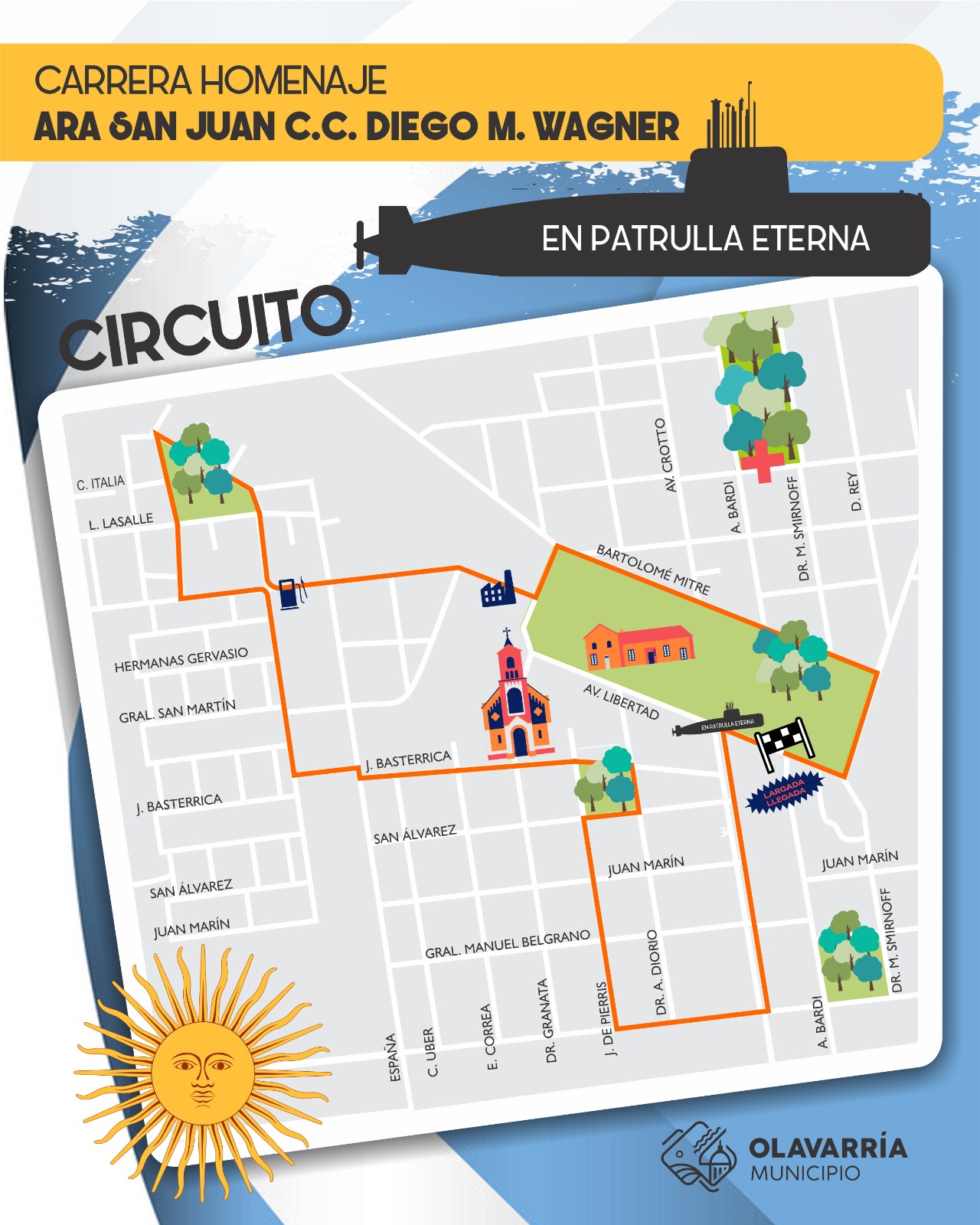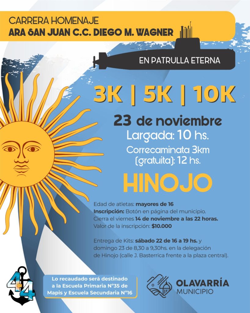 El Municipio de Olavarría informa que el próximo domingo 23 de noviembre se llevará a cabo la carrera “Homenaje ARA San Juan – Capitán de Corbeta Diego Wagner”, una prueba pedestre que es organizada desde la Subsecretaría de Deportes del Municipio, en acuerdo y diálogo además con la familia del héroe olavarriense. Se tratará no sólo de un evento deportivo y un merecido reconocimiento a quienes tripulaban el submarino de la Armada Argentina, sino que además tendrá su ribete solidario, dado que todo lo recaudado será donado a dos instituciones educativas del Partido de Olavarría.