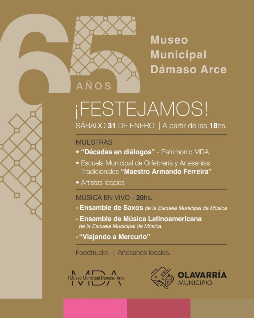 Este miércoles el Museo Dámaso Arce cumple 65 años, por lo que desde el Municipio se hace extensivo el saludo pero más aún el reconocimiento a cada una de las personas que de una manera u otra se han visto vinculados a este emblemático espacio municipal que se ha consolido como un punto de referencia en materia de arte y cultura no sólo de los olavarrienses, sino también de visitantes que diariamente arriban desde distintos puntos del país.