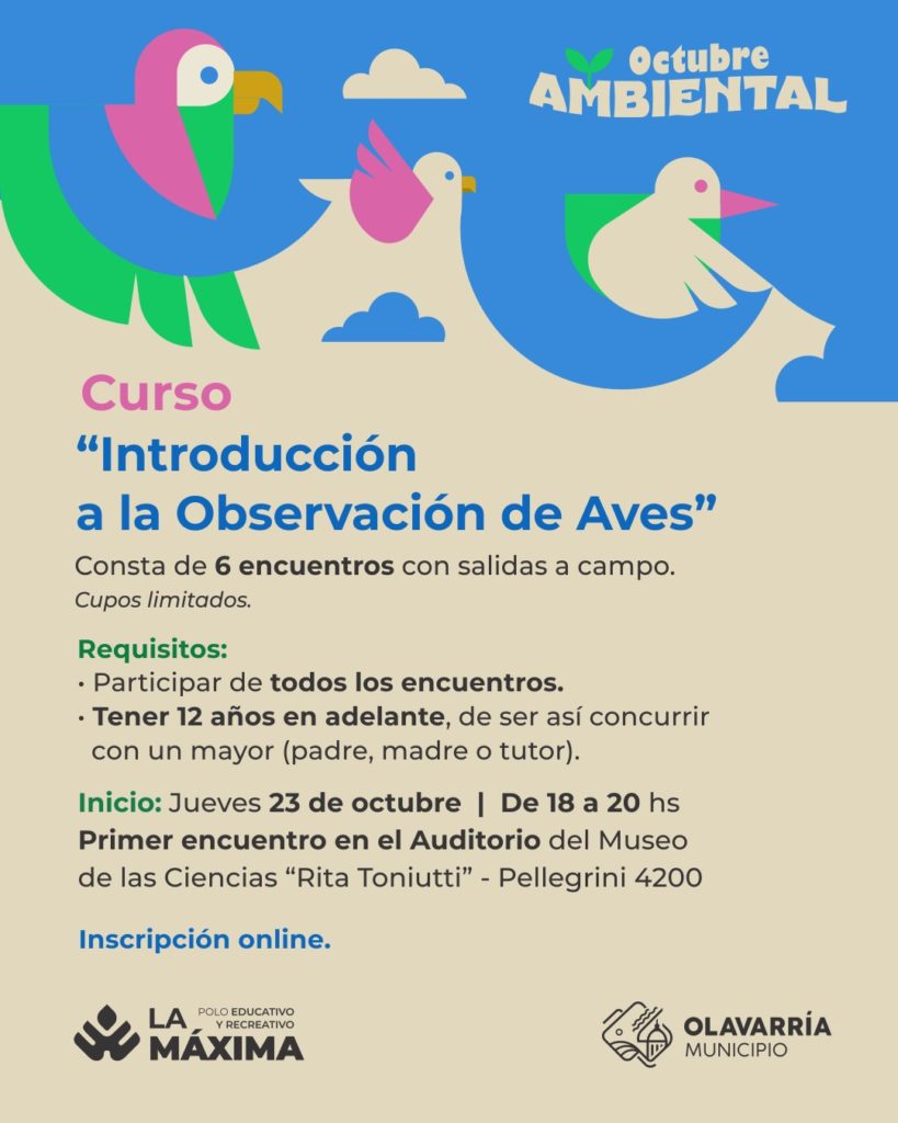 El Municipio de Olavarría informa que se encuentra abierta la inscripción para el curso de “Introducción a la Observación de Aves”, una propuesta impulsada desde el Polo Educativo y Recreativo Municipal La Máxima, en el marco del denominado “Octubre Ambiental”, un mes pleno de actividades pensadas en la concientización, capacitación y también en la promoción de conductas amigables con el ambiente.