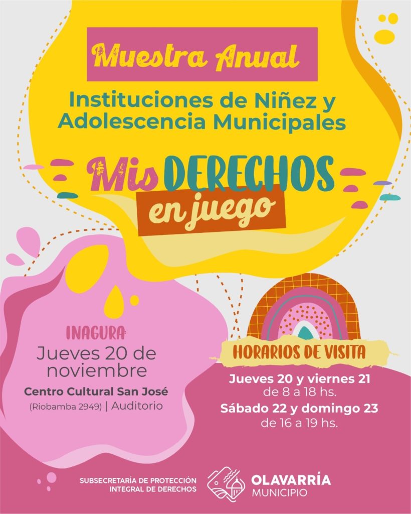 A 20 años de las leyes de Promoción y Protección de Derechos y del Día Internacional de los Derechos de Niños, Niñas y Adolescentes, el Municipio de Olavarría realizará una muestra anual de instituciones municipales destinadas a la niñez y adolescencias. La misma tendrá lugar desde este jueves 20 hasta el domingo 23 de noviembre en el Centro Cultural San José (Riobamba 2949).