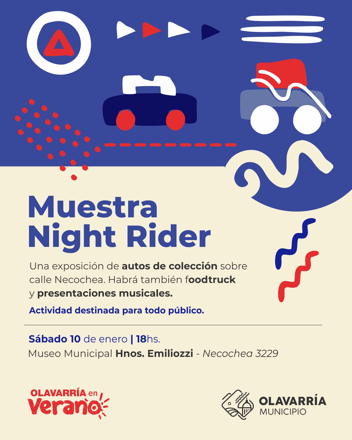 En conjunto con la muestra Night Rider se realizará una exposición de autos de colección sobre calle Necochea. Habrá también foodtruck y presentaciones musicales.