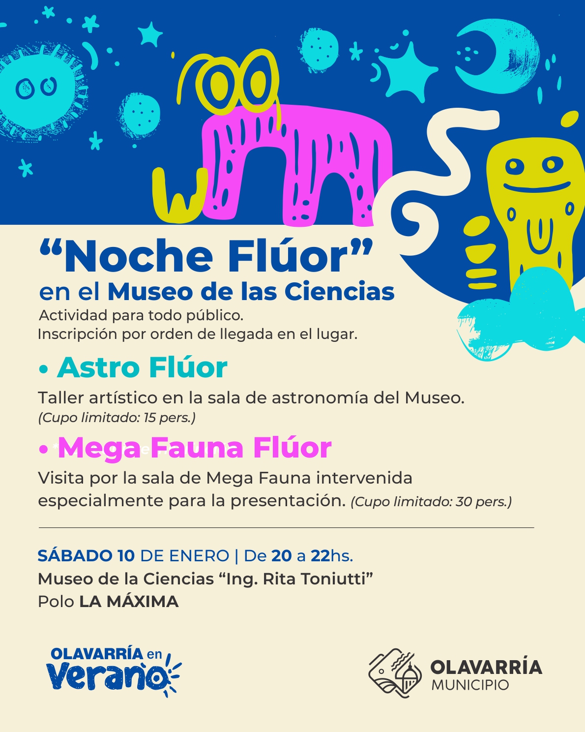 Requiere inscripción. Por orden de llegada en el lugar. Cupos limitados: 1) Mega flúor: 30 personas y 2) Astro flúor 15 personas.
