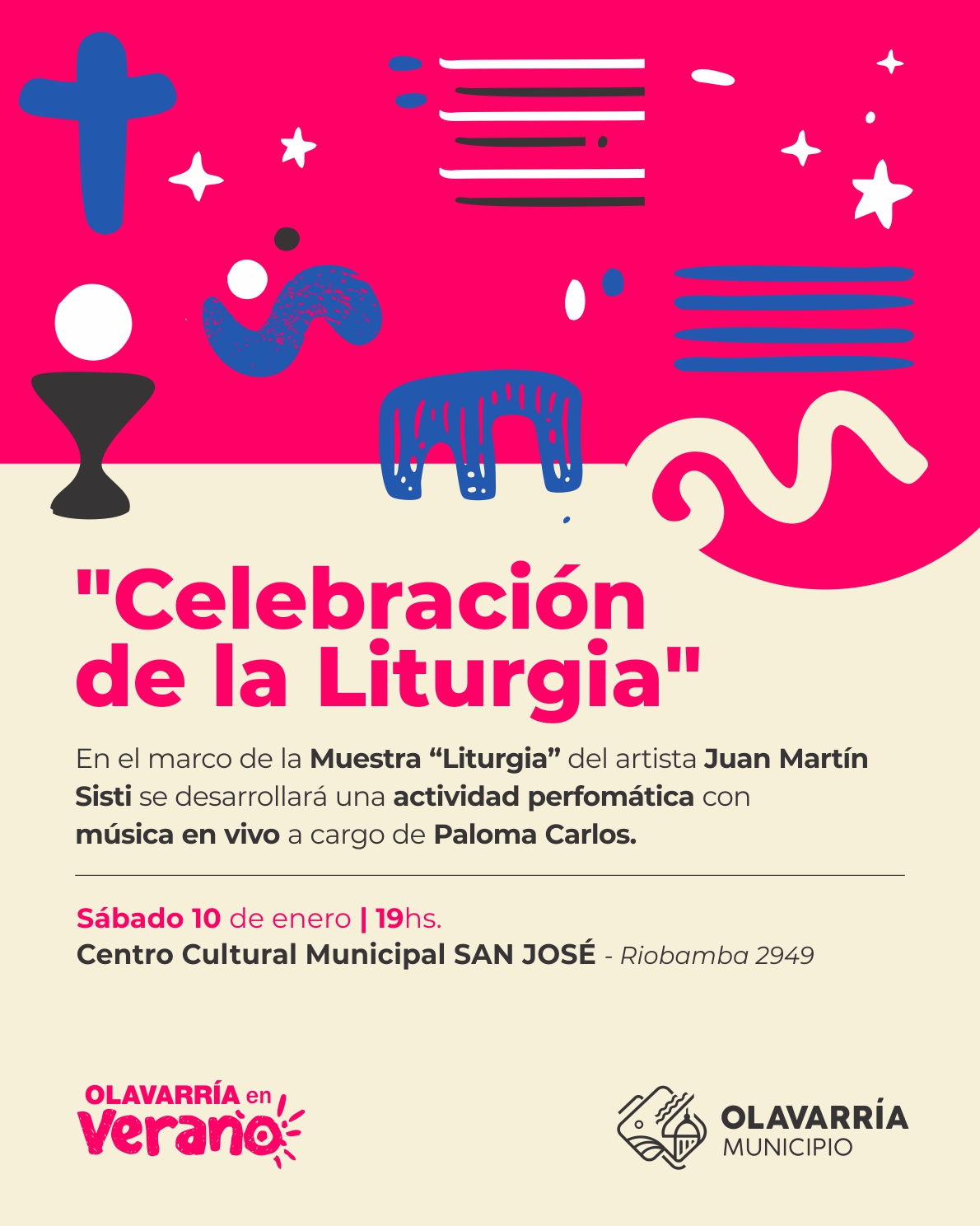 En marco de la Muestra “Liturgia”, artista Juan Martín Sisti, expuesta en Sala 3, se desarrollará una actividad perfomática con música en vivo. Se tratará de un encuentro abierto al público donde se podrá visitar la muestra con una propuesta especial. Contará con la palabra del artista, música en vivo a cargo de Paloma Carlos, y la degustación de un trago compartido.