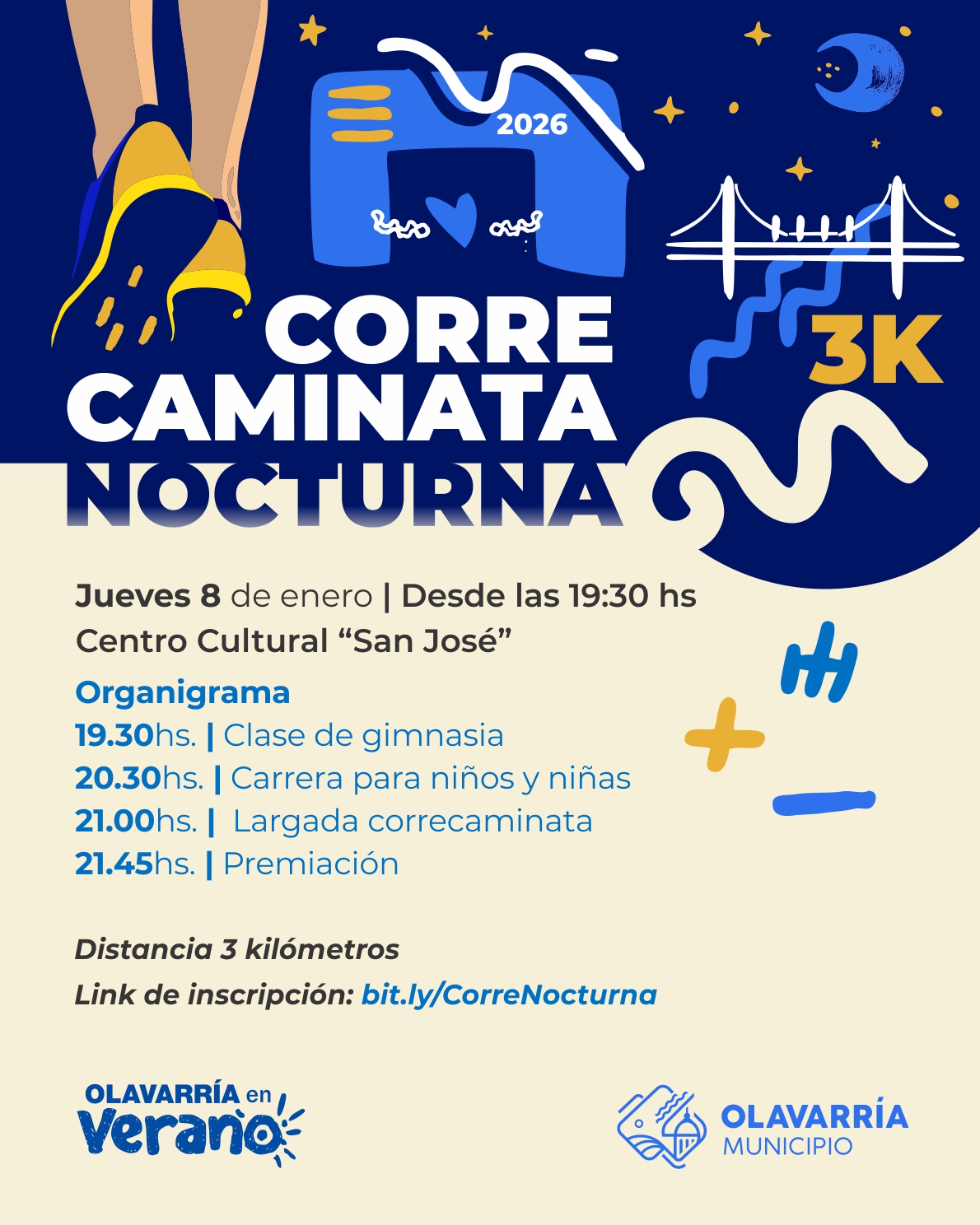 Se trata de la primera Correcaminata Nocturna del 2026 que tendrá como punto de encuentro el Centro Cultural Municipal San José. La prueba principal se largará a partir de las 21 horas con un trazado de 3 kilómetros. En tanto que las propuestas se iniciarán desde las 19:30 horas con una clase abierta de gimnasia que será encabezada por profesoras del staff de Deporte Social de la Subsecretaría de Deportes. A las 20:30 horas será la largada para la carrera de niños y niñas.