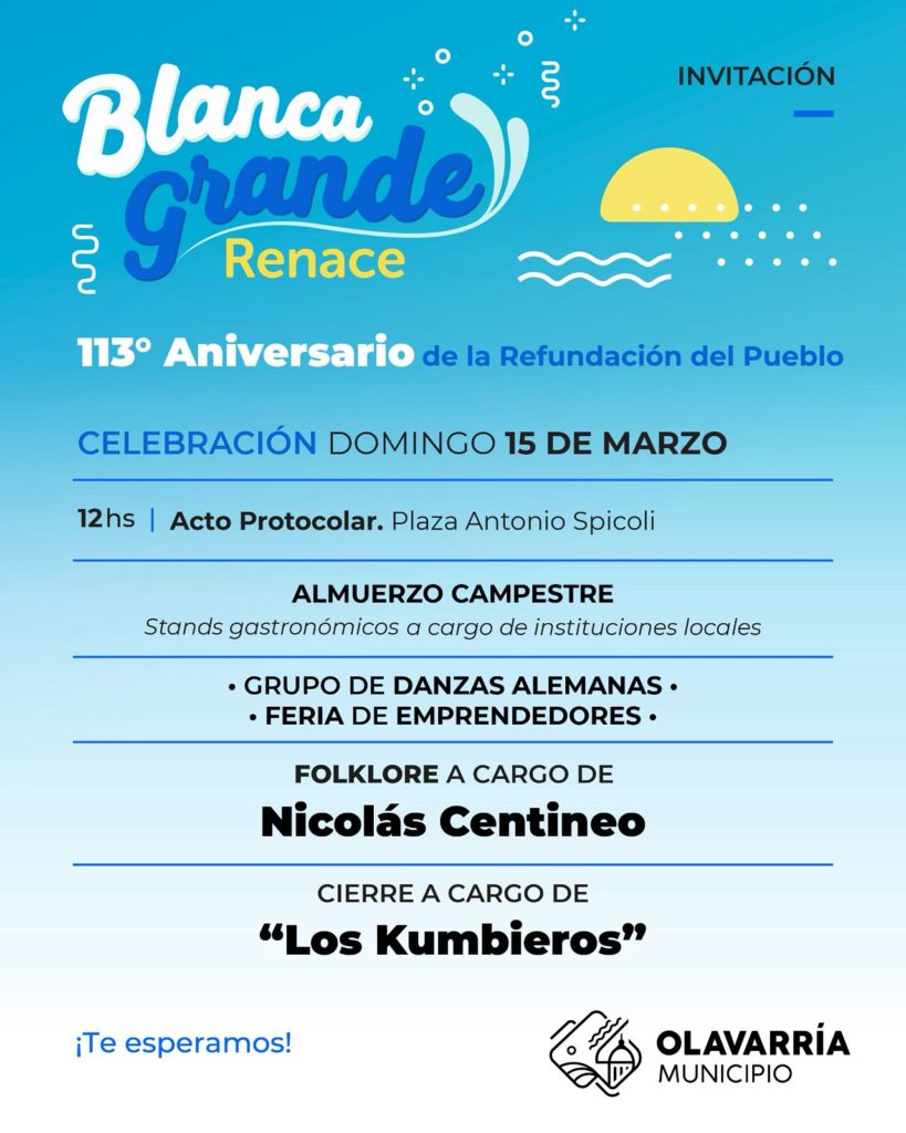 El Municipio de Olavarría invita a la comunidad de todo el Partido y la región a participar de una nueva edición de Blanca Grande Renace, evento que permitirá celebrar el 113° aniversario de la refundación del pueblo. La propuesta es organizada en conjunto desde distintas áreas municipales e instituciones de la localidad rural.