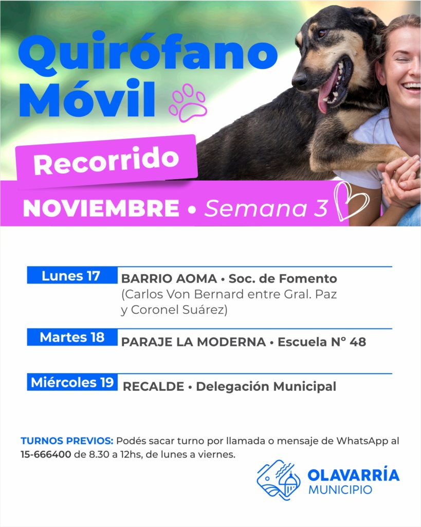 El Quirófano Veterinario Móvil continúa con su recorrido por todo el Partido de Olavarría, ofreciendo de manera gratuita esterilizaciones quirúrgicas caninas y felinas; en el marco de la campaña “Querer es Cuidar”, iniciativa del Municipio de Olavarría.