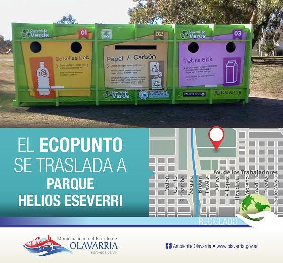 Desde la Dirección de Desarrollo Sustentable se informa que a partir del lunes 2 de enero el Ecopunto móvil que actualmente se encuentra ubicado en el Parque Avellaneda se trasladará al Parque Helios Eseverri.