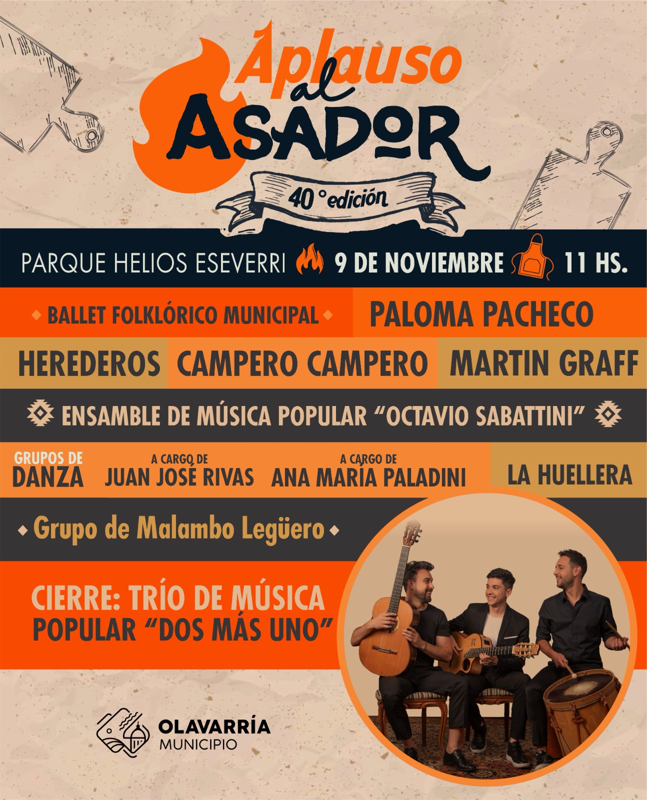 Llega una nueva edición de “Un aplauso al Asador”; la fiesta que reúne la tradición y costumbre criolla. Como todos los años, este evento tiene como eje principal el trabajo conjunto con las instituciones y este año serán 40 las que participarán con la preparación y venta de comidas típicas criollas.