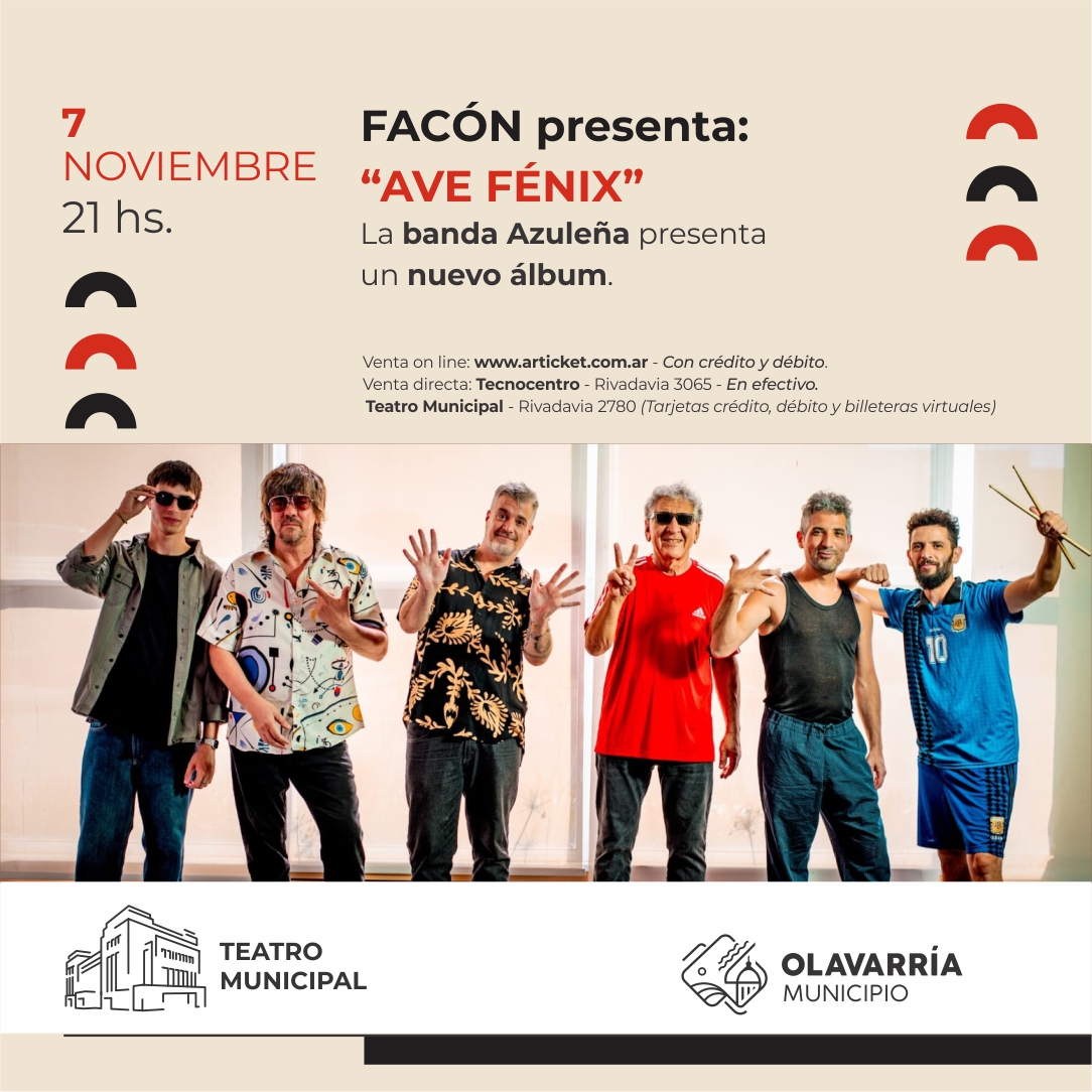 Tras 22 Años Facón regresa con nuevo disco: Ave Fénix. La banda azuleña presenta un nuevo álbum con artistas invitados como Santiago y Valentín Andersen de El Plan de la Mariposa, Nano Campoliete de Bersuit Vergarabat, Ignacio Montoya Carlotto y Abril Alconada.
