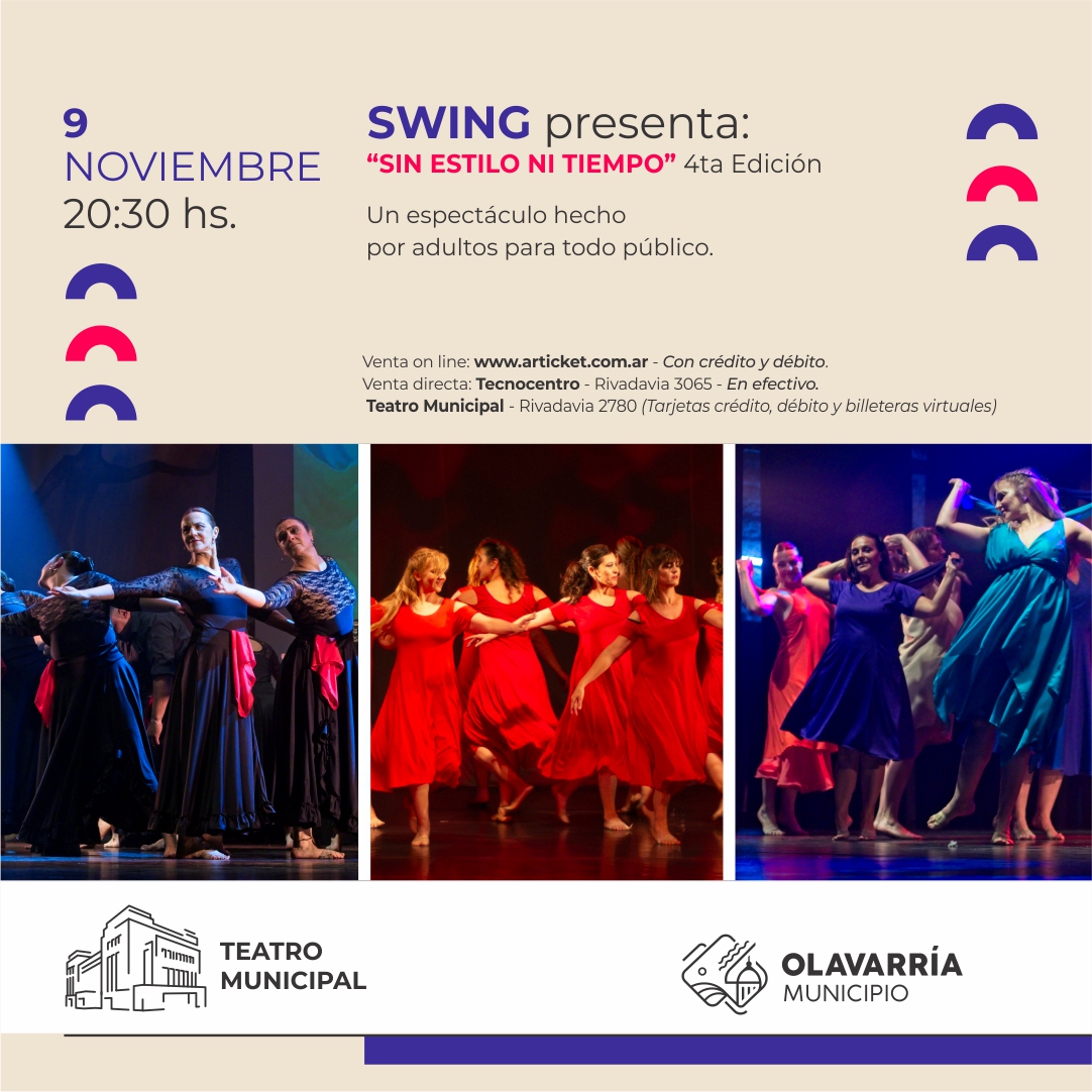 El estudio de danza Swing anuncia la 4ta edición de “Sin estilo ni tiempo”, un espectáculo hecho por adultos para todo público, donde podrán disfrutar de muchos artistas locales en escena. Ellos mostrarán su arte mediante las danzas folklóricas, flamencas, árabes, contemporáneas, modernas, alemanas. Olavarría cuenta con muchas agrupaciones y estudios donde los jóvenes adultos y adultos mayores pueden seguir disfrutando del enorme placer de bailar y además hacerlo con un gran compromiso y profesionalismo.