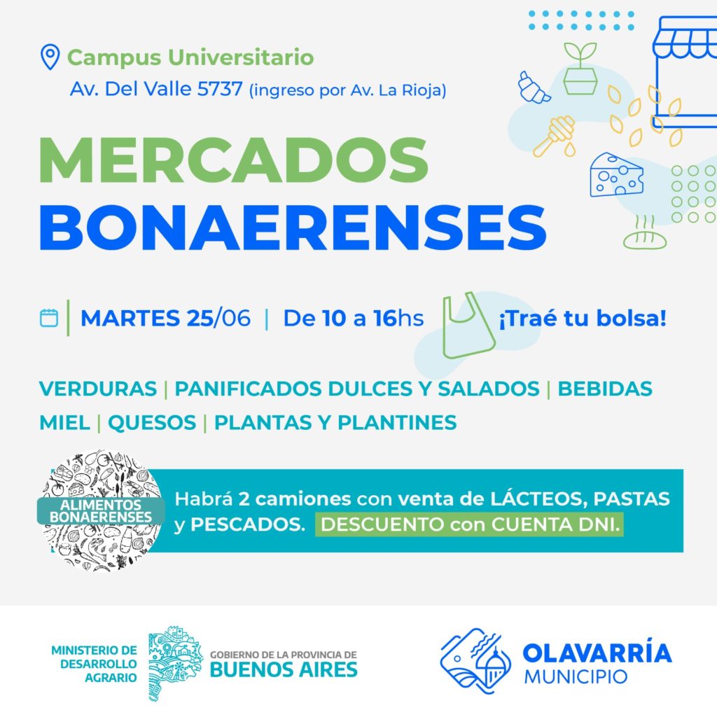 Desde la Secretaría de Desarrollo Económico y Productivo del Municipio de Olavarría, a través de la Coordinación de Economía Popular, se recuerda que este martes 25 de junio se llevará a cabo una nueva edición del programa “Mercados Bonaerenses”.