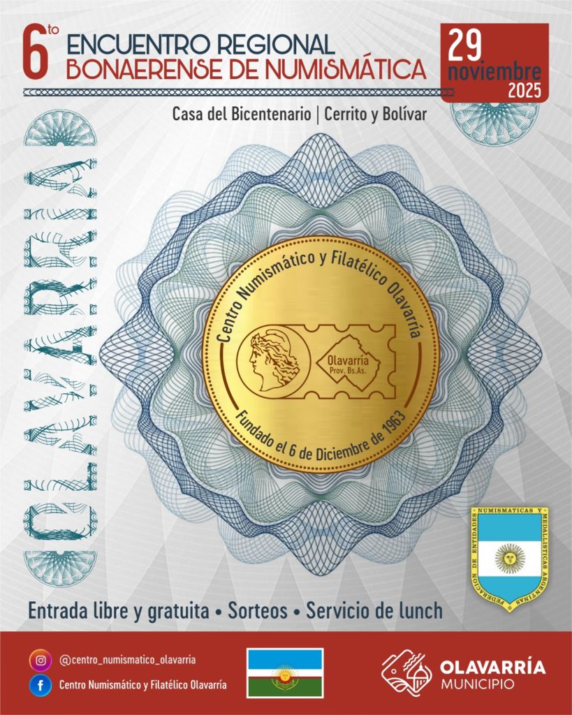 Olavarría será sede este fin de semana del 6º Encuentro Regional Bonaerense de Numismática, que se llevará  cabo este sábado 29 de noviembre, de 9 a 19 horas, con sede en Casa del Bicentenario.