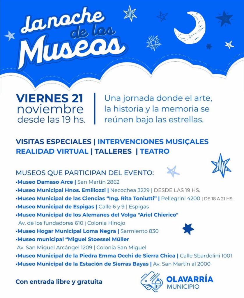 El Municipio de Olavarría recuerda que este viernes se llevará a cabo la primera edición de la “La noche de los Museos en Olavarría”, una jornada donde el arte, la historia y la memoria se reúnen bajo las estrellas.