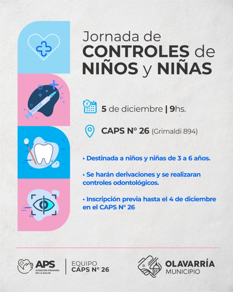 El Municipio de Olavarría, a través de la Subsecretaría de Atención Primaria de la Salud, recuerda que este viernes 5 de diciembre se desarrollará una jornada de controles médicos, a partir de las 9 horas, en el Centro de Atención Primaria de la Salud Nº 26 (ubicado en Grimaldi 894).
