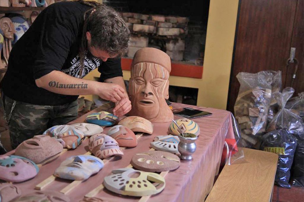 . Sábado 6 de julio, de 14 a 18 horas: Presentación de la Exposición- Taller con puesta en común sobre materias primas locales y de yacimientos de la República Argentina, análisis de las mismas y su correlato en piezas horneadas previamente que serán parte de las obras expuestas para tal fin. Preparación de pasta de arcillas teniendo los materiales previamente mortereados y tamizados, y siguiendo fórmula desarrollada por el Escultor tallerista (2 kg de arcilla por persona aproximadamente). Visualización del documental “Legado de Razas” del escultor Mauricio D’ Amico, realizado por Mangruyo Audiovisuales, puesta en común oral y presentación de bibliografía impresa sobre la elaboración y representación de máscaras a lo largo de la Historia Universal del Arte. Construcción de base para la realización de las máscaras y comienzo de diseño.