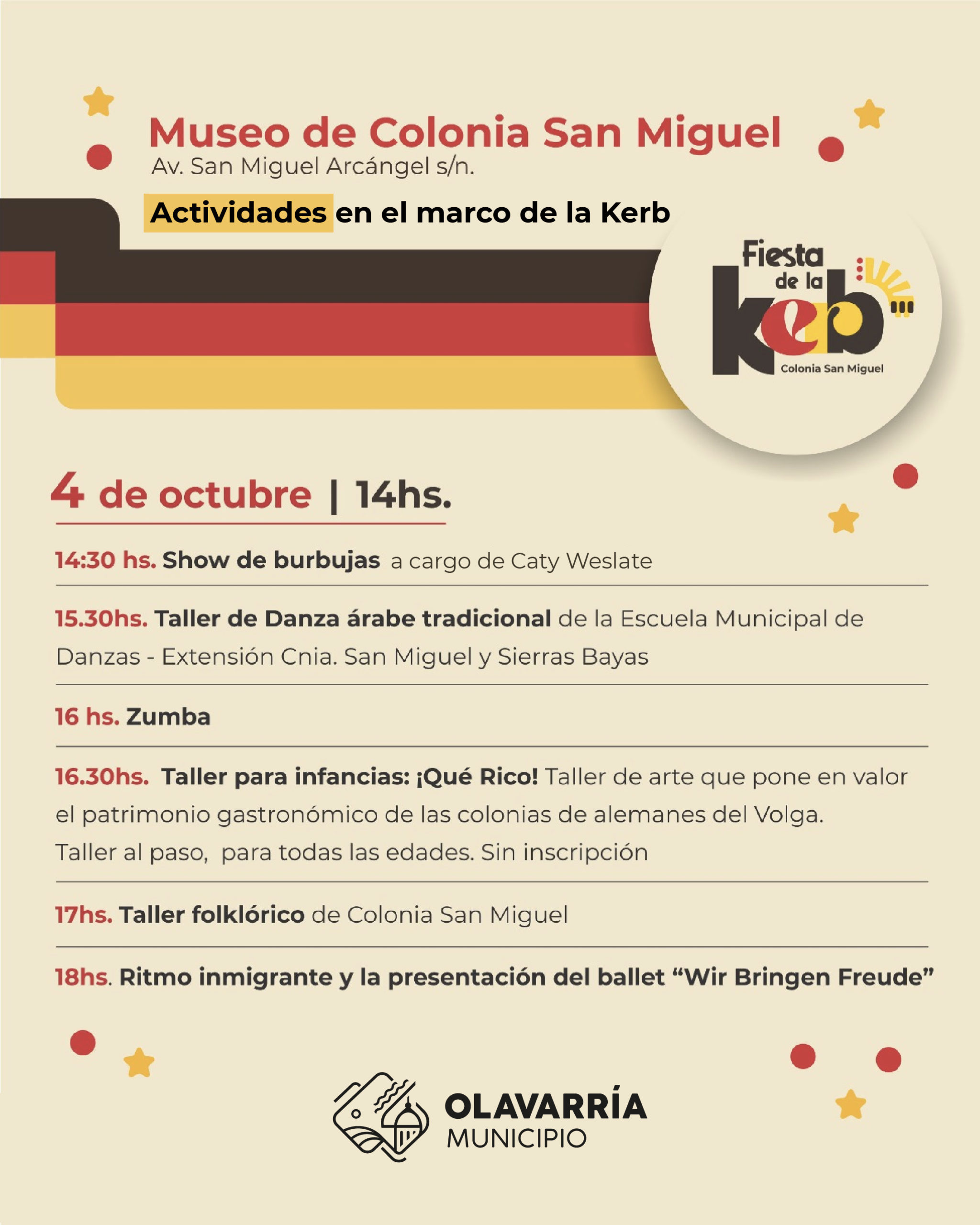 - 13:30 horas: Acto inaugural, palabras de apertura e ingreso de las banderas: Sociedad de Fomento “Los amigos”, Jardín de Infantes N° 920, Escuela N°5 “Independencia Argentina”, Anexo de la Escuela de Educación Media N°2, Iglesia, Centro de Jubilados, Museo Municipal “Miguel Stoessel Müller”, Club Independiente, Unión de Colonias Alemanas del Volga del Partido de Olavarría, Ballet de la Dulce Vida de Mar del Plata, Ballet Vesna de Azul, Ballet Municipal de Danzas Alemanas Bir Bringen Freude y spicheros de Coronel Suárez.