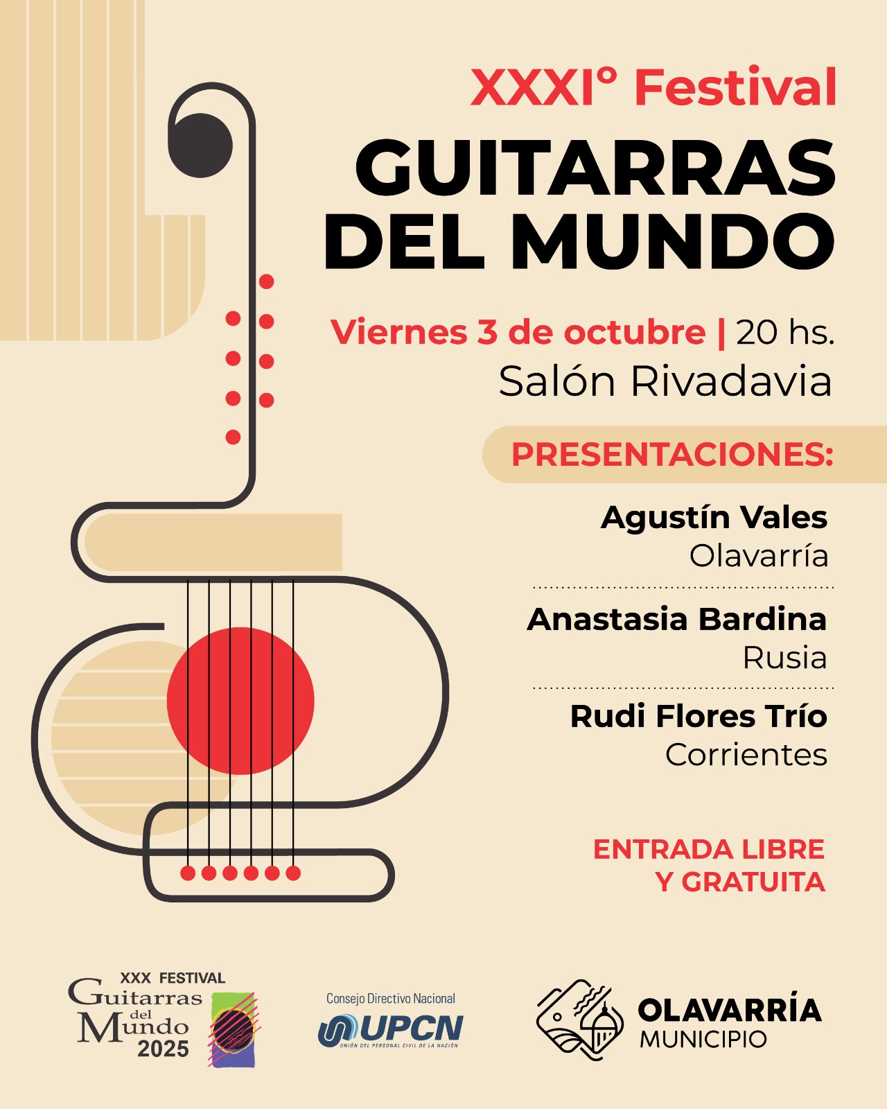 El Municipio de Olavarría invita a participar del XXXIº Festival “Guitarras del Mundo”, que se llevará a cabo el viernes 3 de octubre, desde las 20 horas, en el Salón Rivadavia, con entrada libre y gratuita.