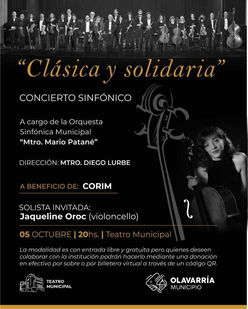 Este domingo 5 de octubre, a las 20 horas, en el Teatro Municipal, tendrá lugar una nueva edición del ciclo “Clásica y Solidaria”, a cargo de la Orquesta Sinfónica Municipal, dirigida por el mtro. Diego Lurbe. En esta oportunidad será a beneficio de la institución local de educación especial CORIM.