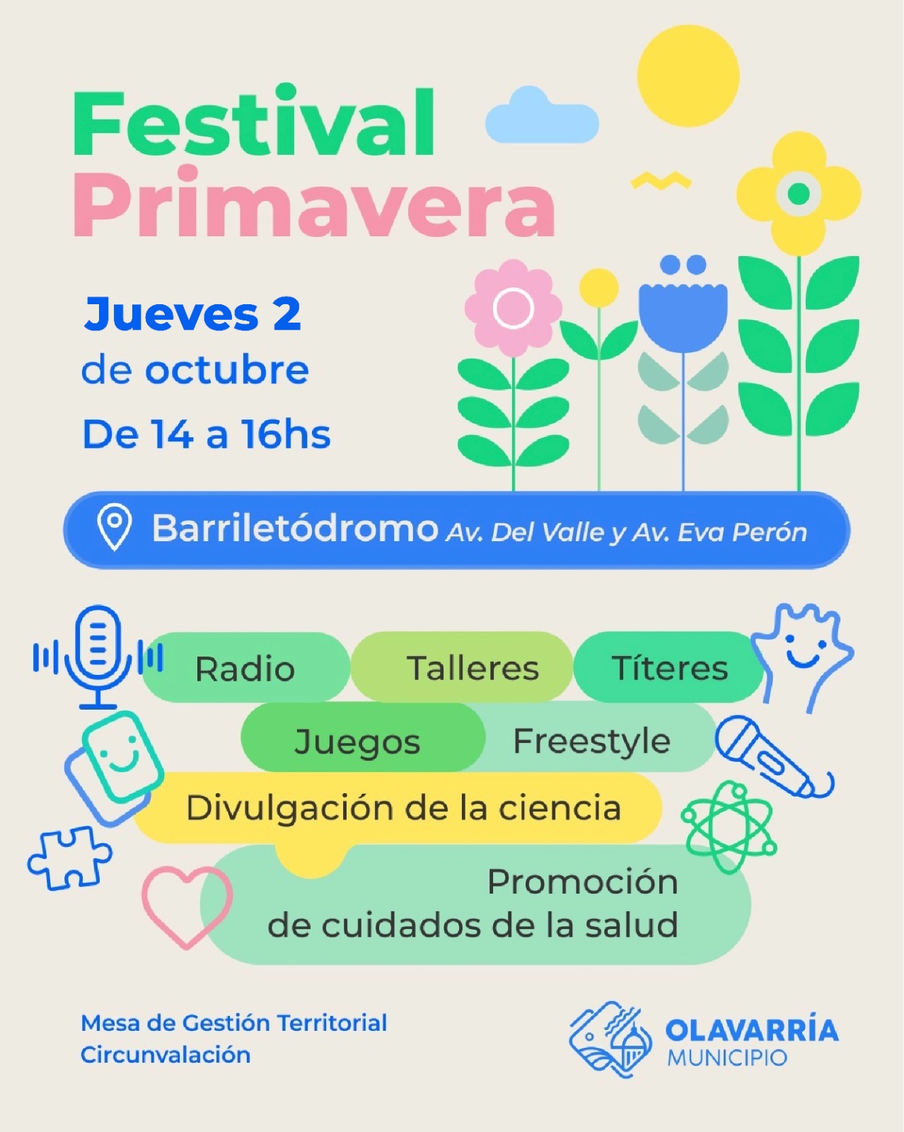 Este jueves, de 14 a 16 horas, en el Barriletódromo (Av. Del Valle y Córdoba), se invita a participar del Festival de la Primavera, organizado por la Mesa de Gestión Territorial Zona Circunvalación.