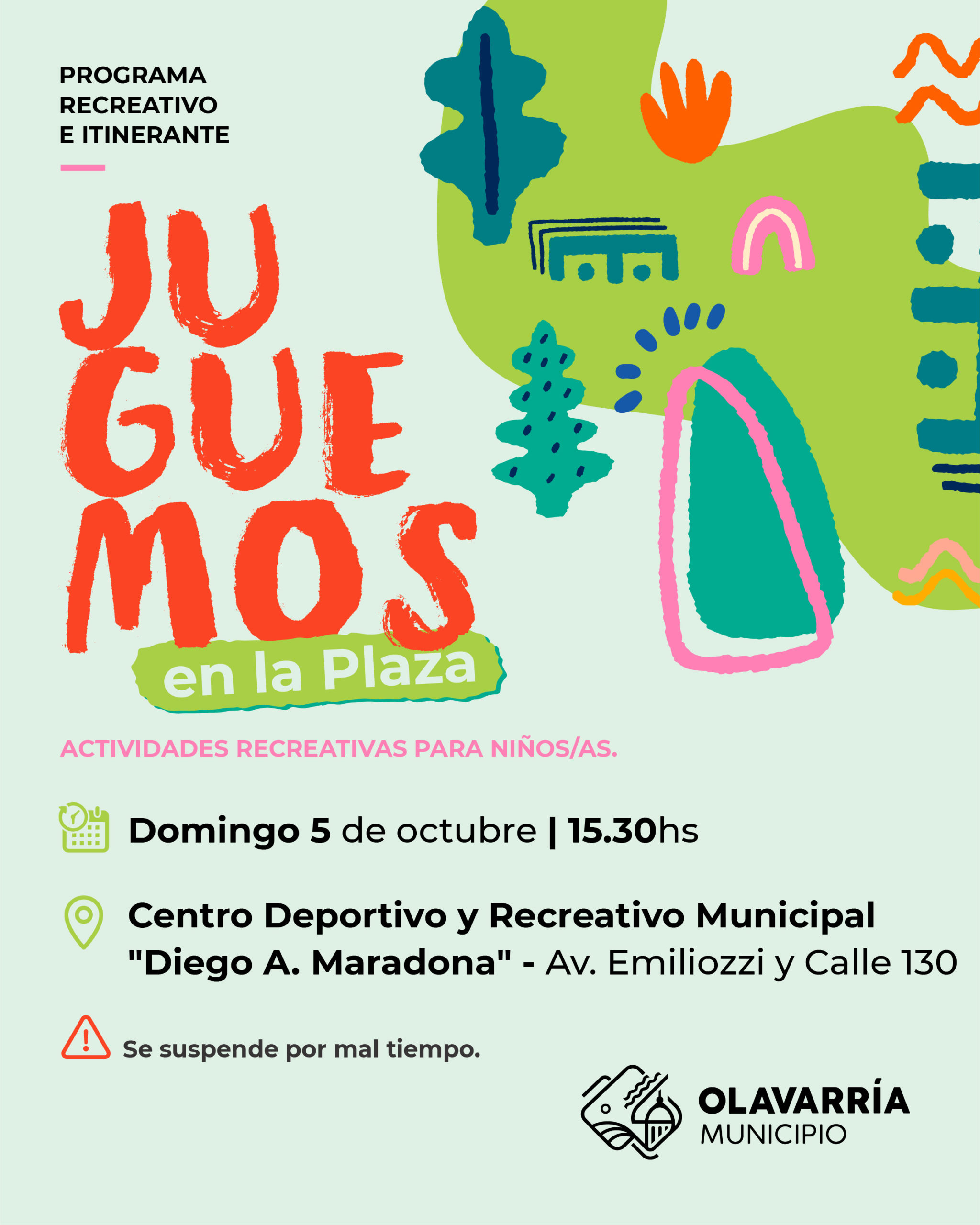 El Municipio de Olavarría informa que el programa recreativo e itinerante “Juguemos en la Plaza” continúa con su recorrido por distintos espacios públicos de todo el Partido. En ese marco, desde la Subsecretaría de Deportes se detalló que este domingo será el turno del Centro Deportivo y Recreativo Municipal “Diego Armando Maradona”.